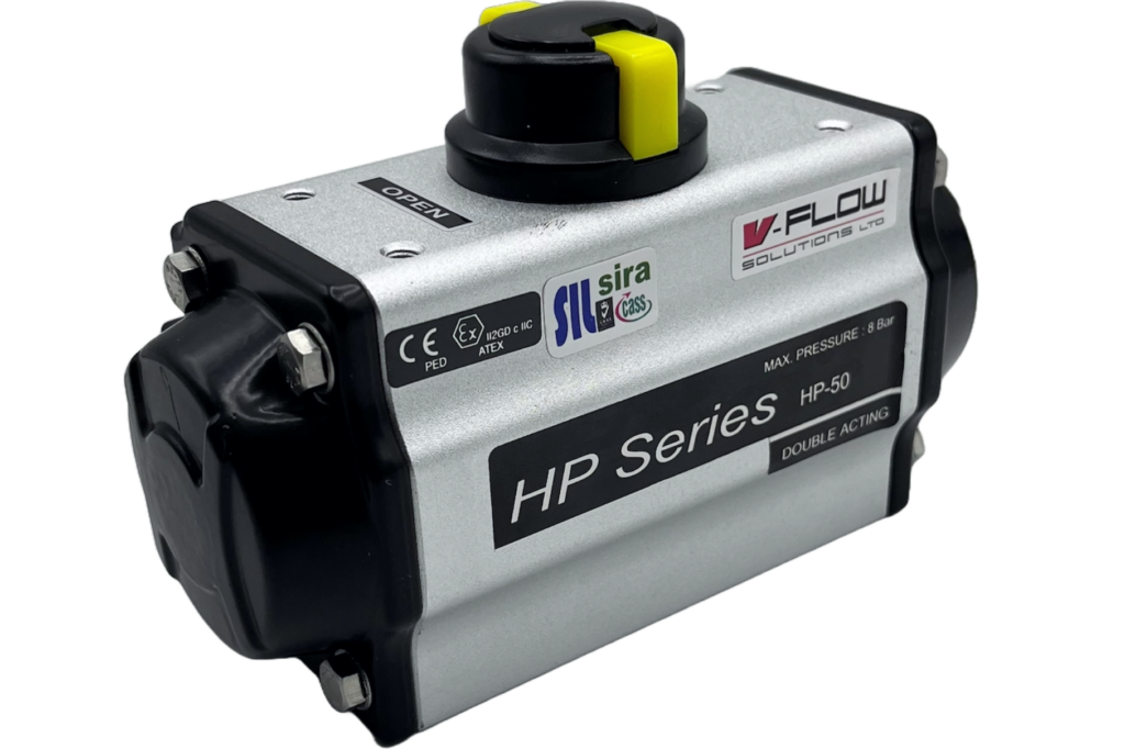 The V-Flow HP series of rack and pinion pneumatic actuators are specifically designed to provide a wide range of torque outputs to suit quarter turn ball, butterfly, plug valves and dampers for a complete valve automated solution.